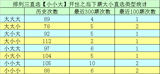 2。在前9次直选【小小大】组合之后,下期开奖号码分别为:712-416-525-460-420-972-790-127-499,组三包含2期,组六包含7期。本期奖号排除对子,看好开出组六。