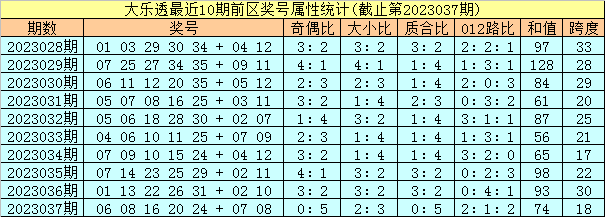 开奖回顾:体彩大乐透第23037期开出奖号为:06 08 16 20 24+07 08,前区大小比为2:3,012路比为2:1:2,质合比为0:5,奇偶比为0:5,后区大小比为2:0,012路比为0:1:1,质合比为1:1,奇偶比为1:1。