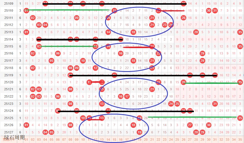 如图所示:体现的是3个局部走势的发展周期,圆圈为密集处的填空,本期定性为新局部走势第5期,架构填空第2期,主力填空第3期,预估蛋跨在小号10-20,即绿色线布局在20-35,本期走势最后期,代表小号多开,开出重号。蛋跨预估1-2枚号码,关注089尾。