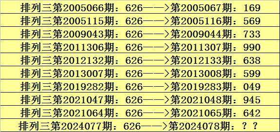 第2024077期排列三奖号为626,历史上该号码直选出现10次,下期奖号分别为:169、569、733、990、638、599、049、945、642。