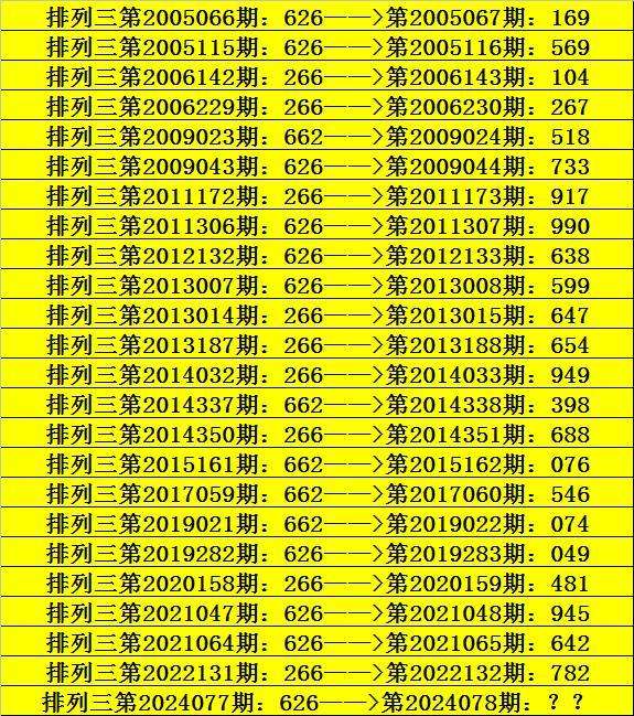 第2024077期排列三奖号为626,历史上该号码组选开出24次,下期奖号分别为:169、569、104、267、518、733、917、990、638、599、647、654、949、398、688、076、546、074、049、481、945、642、782。