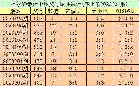 开奖回顾:第2023204期福彩3D奖号为133。奖号形态为组三,大小比为0:3,和值为7,奇偶比为3:0,012路比为2:1:0,跨度为2。