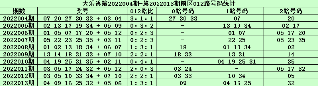 开奖回顾:体彩大乐透第22013期奖号为:04 09 16 25 32+05 06,前区奖号012路比为1:3:1,0路奖号:09,1路奖号:04、16、25,2路奖号:32,后区奖号为:2路号+0路号。