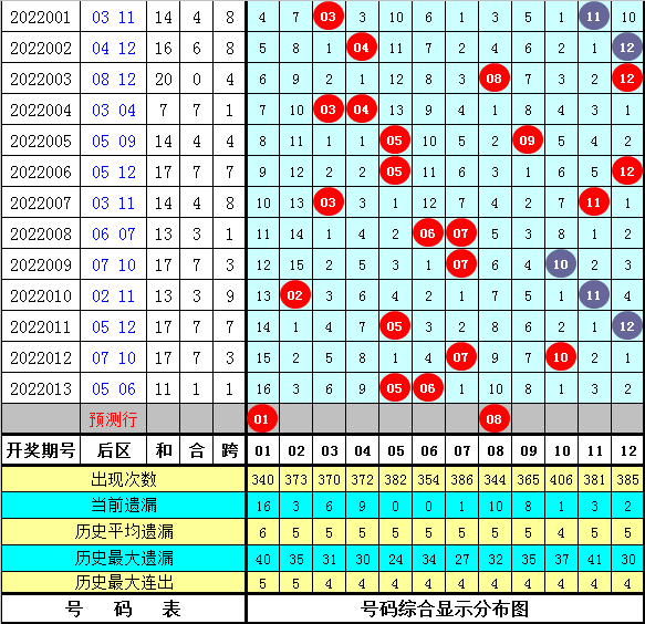 后区分析:后区上期开出奖号05+06,为2路号+0路号,最近10期后区号码012路比为7:6:7,其中号码01、03、04出现2个,号码02、05、07出现1个,号码06、08、09、10、11、12没有出现。本期看好后区在01、04、05、08、10、12之中落号。