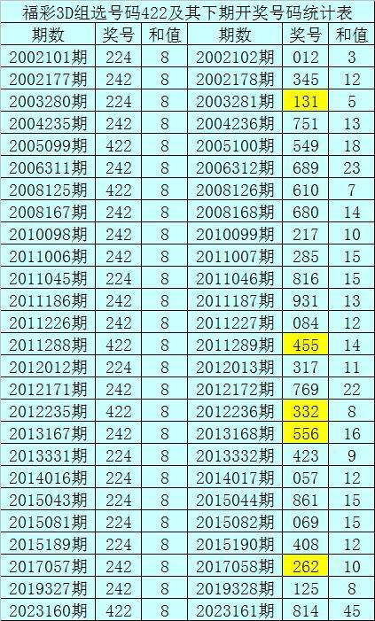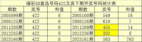 一、开奖回顾:第2023160期福彩3D奖号为422。奖号奇偶比为0:3,和值为:8,跨度为:2。
