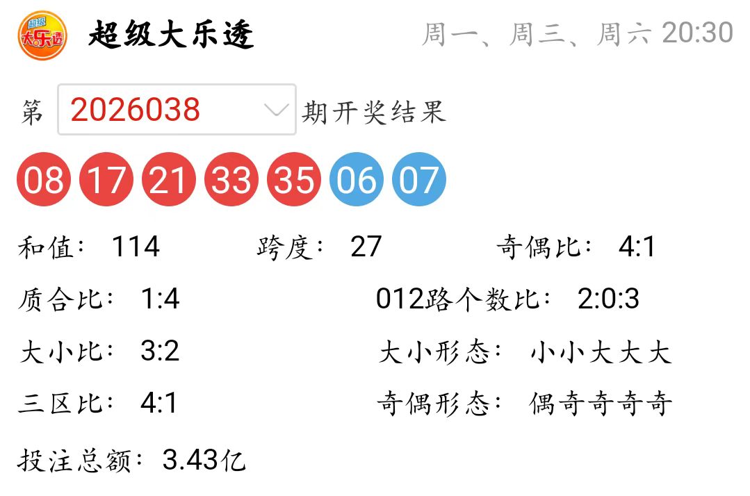 大乐透第2026038期开奖号码如下图: 开出一等奖2注,奖池累计奖金:8亿元 ,详细数据见下图: