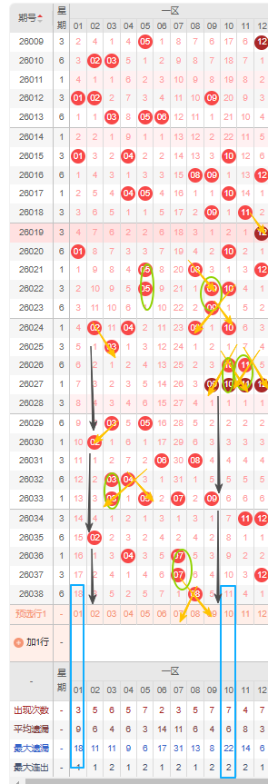 本期一区首先建议关注隔断号,比如02号,前几期开出时依次间隔了5期、4期、本次刚好是3期,可以防开出。其次可以考虑9号,本期距离上次开出间隔了5期,本期如果开出将形成5-5的形态规律。同时邻号可以考虑上期开出的08号的邻号07号和09号本期开出。其次考虑冷号,比如01号,是已经遗漏十期以上且达到最大遗漏值的号,建议放冷号开出。近十期重号次数骤减,本期也可以考虑重号开出。