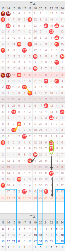 由图可见二区的重号几率并不算很大,近20期开出了1次重号,上次开出重号虽然还没间隔很多期,但本期也可以考虑继续开出上期开出的22号重号。隔断号可以考虑22号,若本期开出将形成3-3的形态规律。