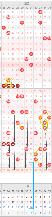 二区选号首先关注冷号31号,已经遗漏了十期以上,且到达自身最大遗漏周期,也已经远超平均遗漏期数,建议可以防冷号开出。另外本期三区个人觉得不会开超过三码,多关注该区冷号防冷号开出。隔断号可以考虑34号,本期若开出则形成3-3的形态。26号若开出将形成1-2的形态。另外考虑27号本期5-4形态开出。