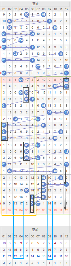 大乐透红球二区断区走冷过后,上期依然是开出了两码,说明二区现在的状态持续走冷,近五期都没有出现两码过,上期开出两码或许有走热的趋势,那么本期可以考虑开出两码及其以上,同时可以防冷号开出。
