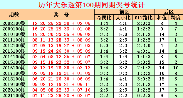 在历史同期奖号中,后区奖号跨度尾数大小比为7:7(定义:跨度1、2、3、10、11为小尾跨度,跨度4、5、6、7、8、9为大尾跨度),开出出现基本相等,本期看好小尾跨度出现,参考跨度2。
