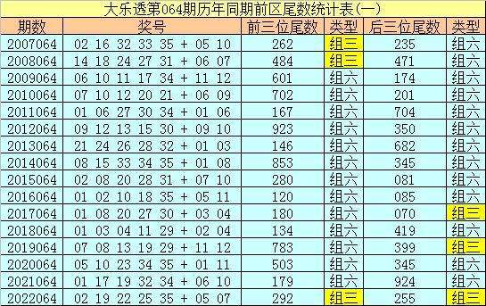 在大乐透第064期历年同期奖号中,前区后三位尾数出号频次分别为:尾数0、4、5出现7个,尾数1、2、3出现5个,尾数7、9出现4个,尾数8出现3个,尾数6出现1个。其中尾数数字三类型豹子、组三、组六次数比为0:3:13,今年同期后三位尾数类型参考组六;