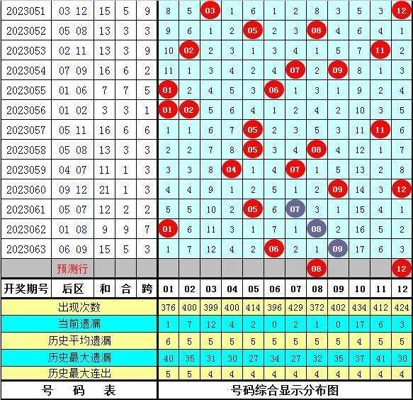 大乐透历年同期第064期后区尾数奇偶比为18:14,最近5年尾数奇偶比为5:5,后区尾数大小比为13:19,最近5年尾数大小比为3:7,本期后区注意号码01、06、07、08、12,后区两码关注08、12。