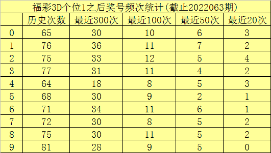 个位杀号:上期个位奖号为1,历史上个位奖号1共开出725次,最近100次个位奖号1出现时,其下期号码0-9开出次数分别为:奖号2开出12次,1、3、6、8开出11次,0开出10次,5、9开出9次,4、7开出8次。