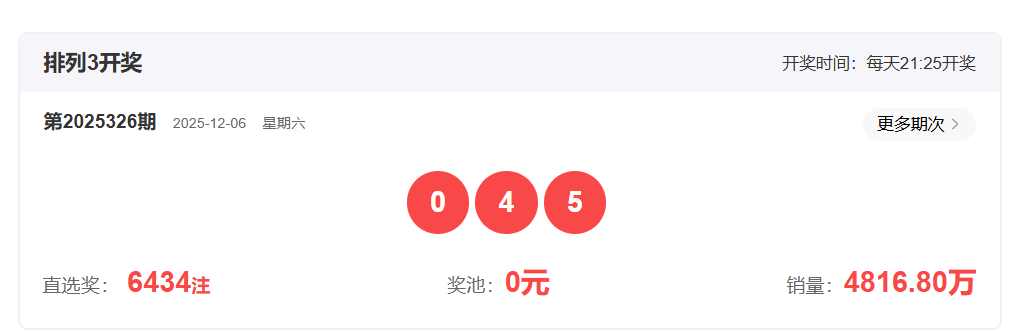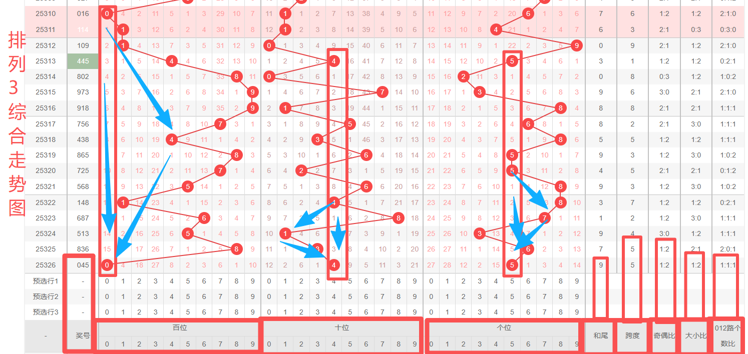 体彩排列3第2025326开奖号码045,形态为组六,奇偶比1:2,和值9,跨度5,大小比1:2,【012】路个数比1:1:1。