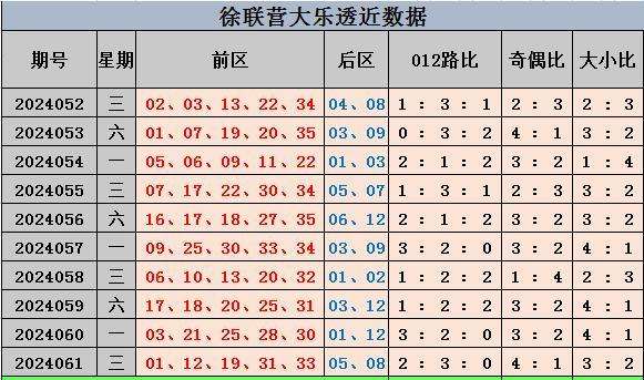 062期徐联营大乐透预测奖号:012路比和奇偶比