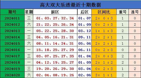 上期回顾,大乐透第2024020开奖,本期奖号:前区02 04 08 19 26;后区02 06,当期前区号码大小比为2:3,三区比3:1:1,奇偶比1:4。前区未开出连号,开出重号19 26。