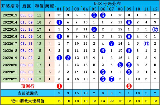 后区奖号分析:上期后区奖号为06和07,在近10期奖号中,后区奖号频次分别为:号码03、04、10出现0个,号码02、08、11、12出现1个,号码05、07出现2个,号码01出现3次,号码06出现4次,号码09出现5次,本期后区号码大范围参考:01、03、04、09、12,单挑一注:01 + 09。