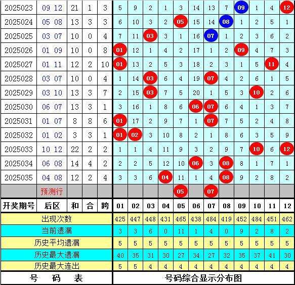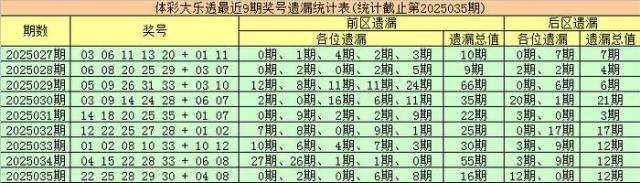 金大玄第2025036期体彩大乐透前区遗漏分析(定义,遗漏0-4期号码为热码,遗漏5-12期奖号为温码,遗漏13期及以上为冷码):