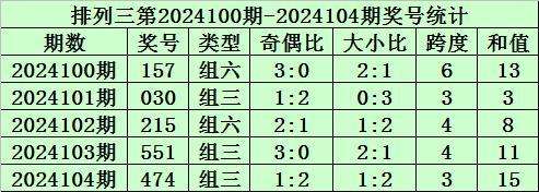 上期回顾:排列三第2024104期开奖号码为474。奖号类型为组三,奇偶比为1:2,大小比为1:2,跨度为3,和值为15。