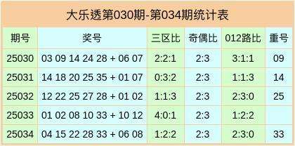 大乐透第25034期开出奖号为:04、15、22、28、33 + 06、08,前区三区比1:2:2,奇偶比为2:3,012路比为2:3:0,开出1枚重号33。