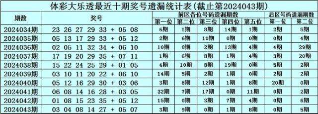 第2024043期奖号:03 04 08 14 27 + 05 07 ,各位号码遗漏期数为:3期、9期、0期、1期、8期 + 0期、5期。