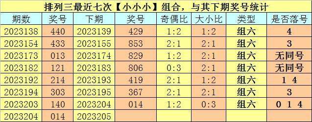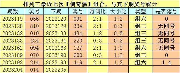开奖回顾:排列三第2023204期开奖号码为:014。奖号类型为:组六,大小类型为:小小小,奇偶类型为:偶奇偶,包含重号:0 1 4。