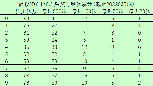 百位杀号:上期百位开出号码0,历史上百位号码0已开出703次了,最近100次百位号码0出现之后,其下期各号码频次分别为:号码8出现15次,1出现14次,0、4出现12次,6、9出现10次,7出现9次,5出现8次,2出现7次,3出现3次。