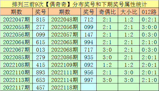 在最近9期开出奇偶分布:偶奇奇的奖号为:815-277-099-615-013-279-415-893-653,在下期出现号码分别为:712-099-147-994-717-935-092-956-997。其中百十个位号码分布情况如下:
