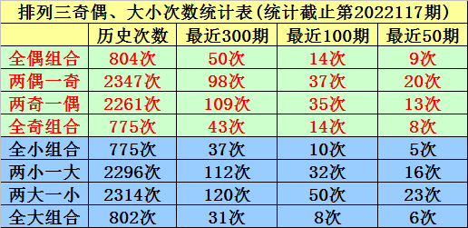 排列三第2022117期奖号为457,直选奇偶分布为:偶奇奇,该奇偶分布历史上共出现了761次,前100期出现12次。