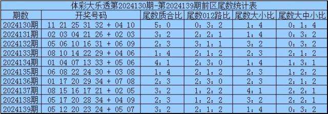 体彩大乐透第2024139期开奖号码为:05 12 20 23 24 + 05 07其中前区奖号奇偶比为2:3,大小比为3:2,012路为2:0:3,前区尾数质合比为3:2,012路比为2:1:2,大小比为1:4,大中小比0:3:2。