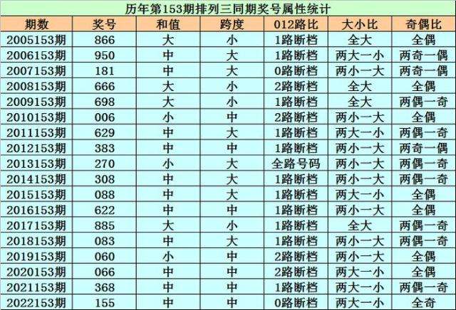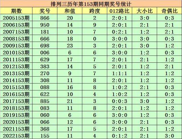 历史上第2023153期排列三已开出18期奖号了,历年同期奖号分别为:866、950、181、666、698、006、629、383、270、308、088、622、885、083、060、066、368、155,详细统计见下表: