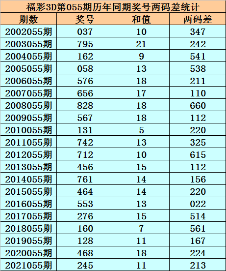 福彩3D第055期,历史上期开出20次奖号,其奖号分别为:037、795、162、058、576、656、828、567、131、742、712、456、761、464、553、276、160、128、468、245,奖号两码合差分别开出: