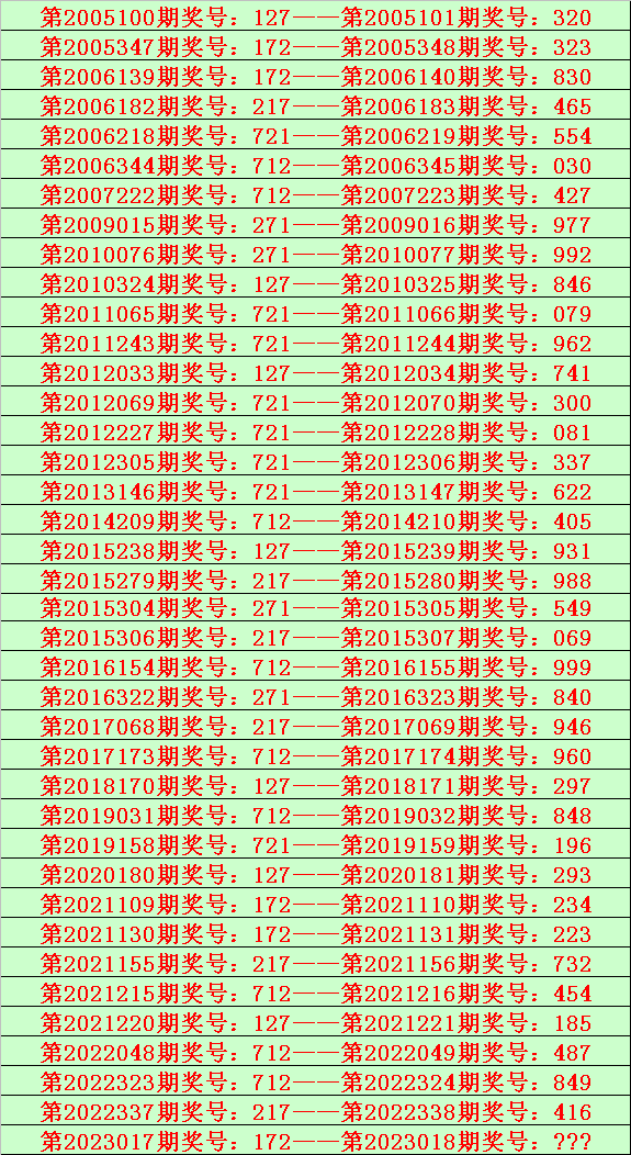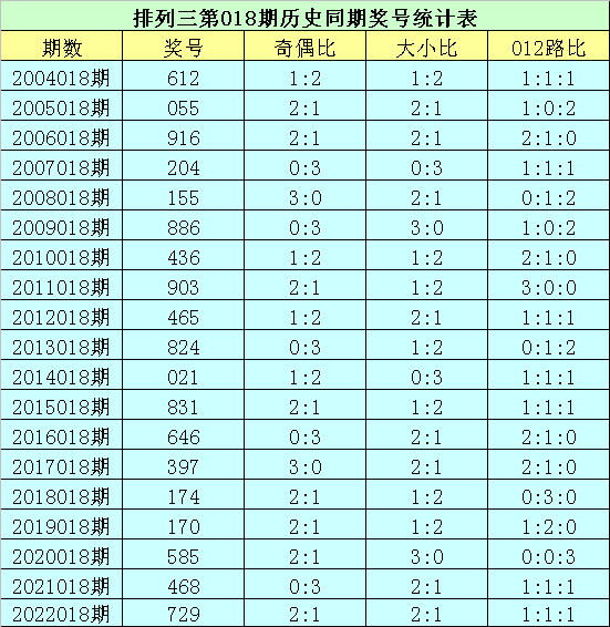 排列三第2023018期开奖日期:2023年1月18日,历史上第018期已开出了19次奖号,历年同期号码分别为:612、055、916、204、155、886、436、903、465、824、021、831、646、397、174、170、585、468、729。