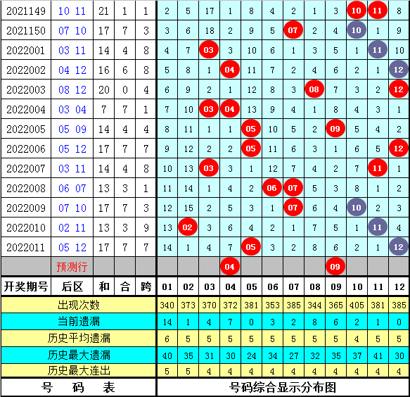 2、后区和值分析:在第012期历史同期奖号中,后区和值分别为:18-5-22-17-19-9-13-12-14-15-19-18-17-4-10,和值012路比为5:6:4,奇偶比为8:7,大小比为10:5,今年第012期看好出现大号和值,关注和值13。