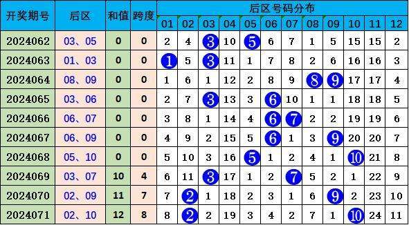 前区一区(01-12):上期该区开出2个奖号,近10期共开出14个奖号,本期推荐该区奖号:05、12。