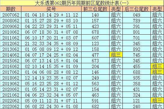 在大乐透第062期历年同期奖号中,前区后三位尾数出号频次分别为:尾数4出现8个,尾数3、5出现7个,尾数1、8出现6个,尾数9出现5个,尾数0、2出现4个,尾数7出现3个,尾数6出现1个。其中尾数数字三类型豹子、组三、组六次数比为0:3:14,今年同期后三位尾数类型参考组六;