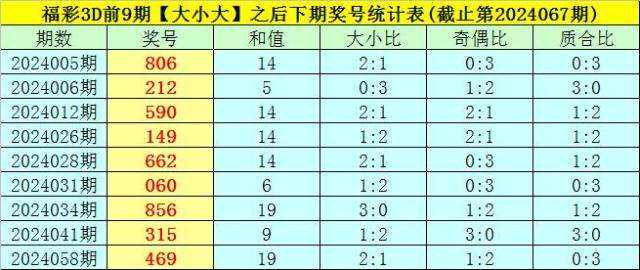 一、上期回顾:福彩3D第2024067期奖号为:709,奖号类型开出组六,大小比为2:1,奇偶比为2:1,和值为16,跨度为9,012路比为2:1:0。