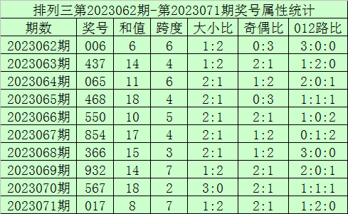 上期回顾:排列三第2023071期开奖号:017,奖号和值:8,奇偶比2:1,大小比1:2。