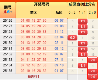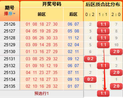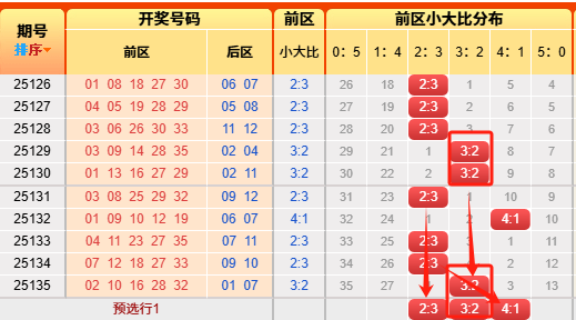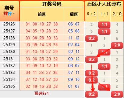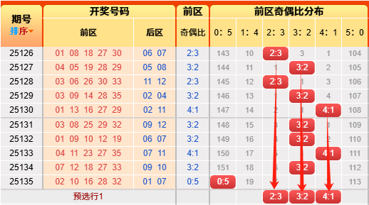 上期前区小大比3:2,推测正确,近期统计56期中50期。言归正传我们继续用历史数据说话,前区小大比分成6种0:5、1:4、2:3、3:2、4:1、5:0(如图),我统计了一下历史出现次数,0:5出现106次、1:4出现513次、2:3出现972次、3:2出现808次、4:1出现351次,5:0出现53次,再看近10期小大比出现次数比为0:0:6:3:1:0,通过历史数据对比观察以及根据遗漏对称理论原则,故本期我们选择2:3、3:2、4:1;(具体精准方向请查看小车小大比精选)