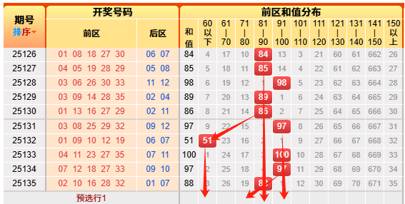 上期开出和值88,命中和值范围。本次我们先根据历史次数统计,和值60以下开出248次、61-70开出234次、71-80开出367次,81-90开出485次、91-100开出496次,101-110开出380次、111-120开出312次、121-130开出155次、131-140开出90次、141-150开出26次、150以上开出9次,再来看近十次以上和值分别开出了1次、0次、0次、5次、4次、0次、0次、0次、0次、0次、0次 ,低于阈值的有60区间以下、61-70区间、81-90区间、91-100区间、101-110区间、121-130区间,再根据遗漏斜率对称理论,本期注意60区间以下、91-100区间、81-90区间、71-80区间。