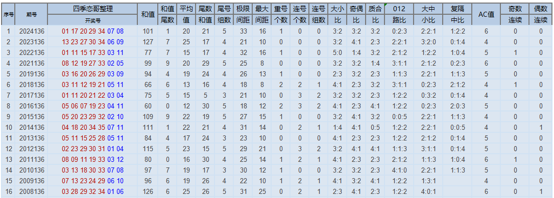 下图为大乐透彩种诞生以来每年的136期各类数据以及历年同日期开奖数据,各位大佬及彩友们请拿走~