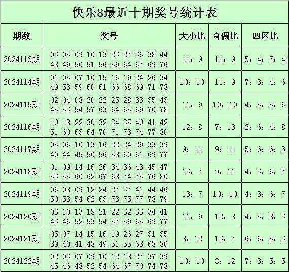 福彩快乐8第2024122期开奖回顾:02 03 07 09 10 12 18 27 37 39 45 46 48 52 54 64 67 70 74 78,其中奖号四区比为7:3:5:5,奇偶比为8:12,大小比为10:10。