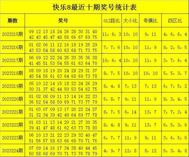 福彩快乐8第2023224期开奖回顾:07 09 14 16 17 34 38 40 44 45 50 58 68 69 70 71 73 76 78 79,其中奖号012路比为4:9:7,和值为956,跨度为72,奇偶比为8:12。
