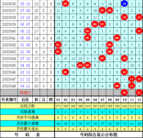 后区分析:在历史同期开奖中,后区跨度奇偶比为5:11,跨度大小比为8:8(大于3的跨度为大跨度,3以内的跨度为小跨度),本期看好跨度为偶数,关注跨度2。