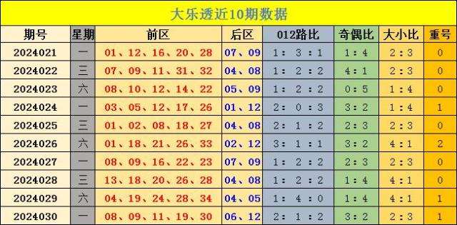 前区大小:上期前区大小比为2:3,前10期前区大小比为24:26,本期看好前区大小比2:3。