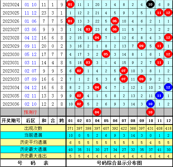 二、后区预测:后区上期开出号码02、10,为重号+温码,目前后区遗漏值4以内的热码有7个:02、04、07、09、10、11、12;遗漏值5-11之间的温码有4个:01、03、05、06;遗漏值12以上的冷码有1个:08、本期看好出现重号,关注两码04、10。