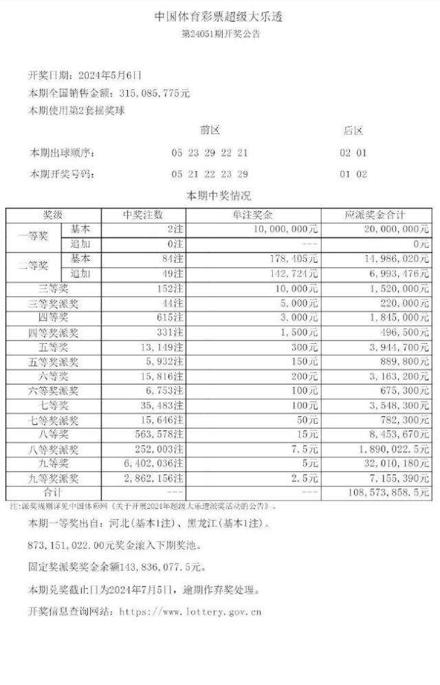 北京时间5月6日晚,体彩超级大乐透第24051期开奖,同时本期也是大乐透10亿大派奖的第22期。当期开奖号码为前区05 21 22 23 29,后区01 02。本期全国销量为3。15亿元,计奖结束后奖池余额8。73亿元。