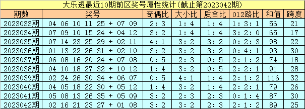 开奖回顾:体彩大乐透第23042期开出奖号为:02 16 21 23 27+01 08,前区质合比为2:3,奇偶比为3:2,大小比为3:2,012路比为2:1:2,后区质合比为1:1,奇偶比为1:1,大小比为1:1,012路比为0:1:1。