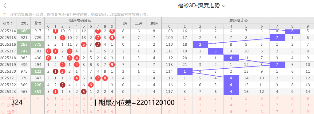 二码差特指开奖号码中三个数字两两相减后的绝对值,其核心价值在于通过数字间距特征进一步缩小选号范围。在 1000 注号码中,最小二码差仅包含 0、1、2、3、4 五个数值,且对应明确号码类型: 位差 “0”:包含组三、豹子号码(直选 280 注、组选 100 注); 位差 “1”:全为半顺号码(直选 384 注、组选 64 注); 位差 “2、3、4”:均为杂六号码(直选 336 注、组选 56 注)。 本期采用 “最小二码差缩圈法”,结合近十期最小二码差的开出频率、冷热趋势及分布规律研判,